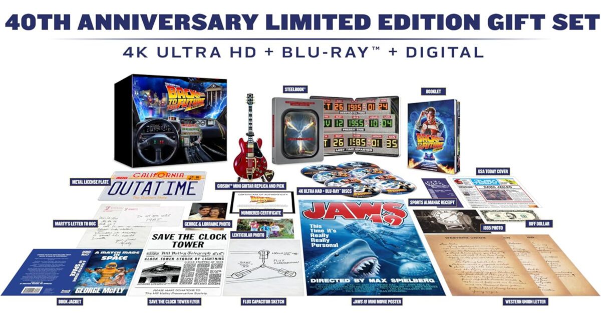 Additionally, Amazon is selling an Amazon-exclusive trilogy gift set, which comes with its own steelbook that’s different from the individual ones, plus a ton of physical goodies, including an OUTATIME license plate and a mini guitar replica. It’s wild.